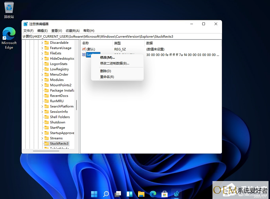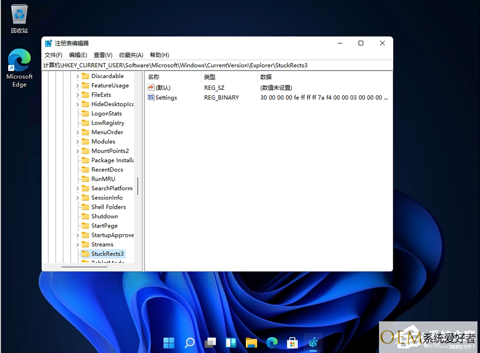 然后定位到这里:HKEY_CURRENT_USERSoftwareMicrosoftWindowsCurrentVersionExplorerStuckRects3