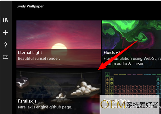 5、这款软件配备了很多款动态壁纸可以选择。只需打开应用程序,从库中选择想要的一个。比如这里就选择了Parallax.js,返回桌面,动态壁纸就设置完成了。