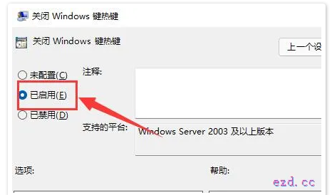 6、更改左上角选项为“已启用”并保持。更改完成后重启电脑即可关闭win11快捷键。