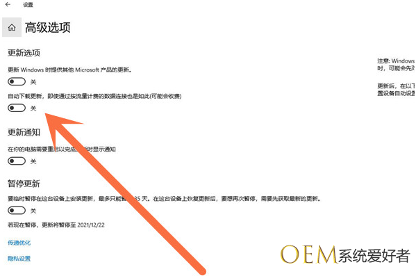 4、然后将自动下载更新的开关关闭即可关闭提示升级win11。