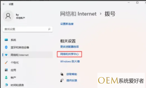 2、依次点击网络和 Internet 拨号,点击相关设置下的网络和共享中心。