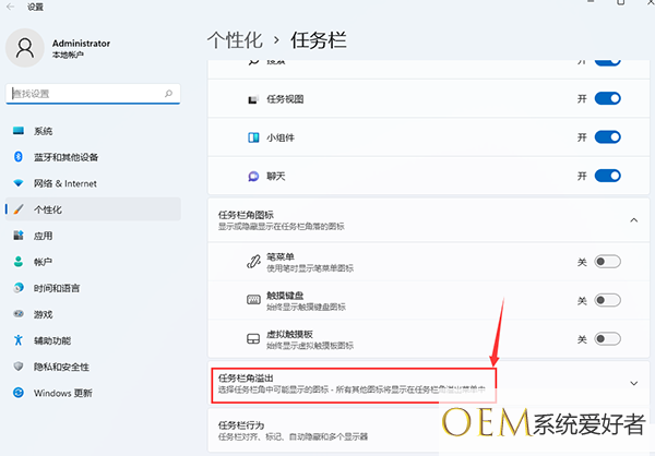 2、进入任务栏角溢出,将要显示的应用图标开关关闭即可隐藏;