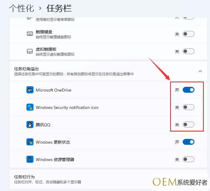 3、点击任务栏角溢出之后,接着将要显示的应用图标开关关闭即可隐藏。