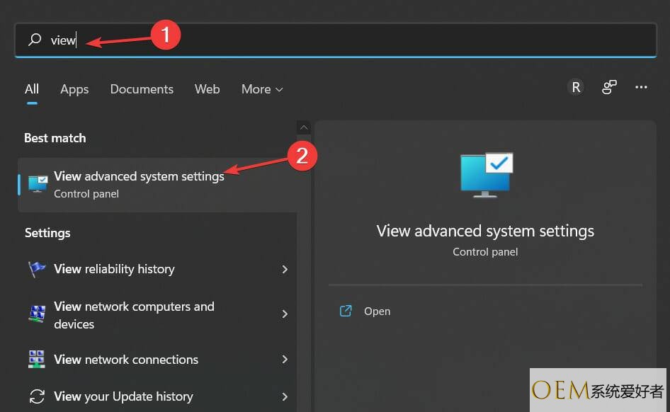 打开windows 搜索功能并输入查看高级系统设置。单击最上面结果。
