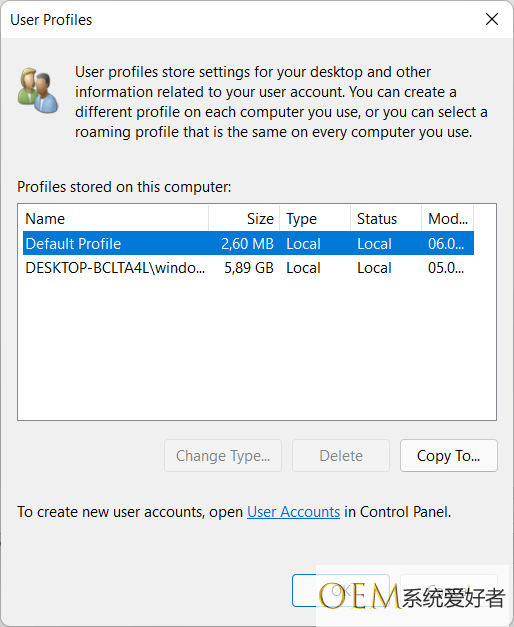 在用户配置文件设置下,您将能够查看您配置文件并复制它们或更改它们类型。