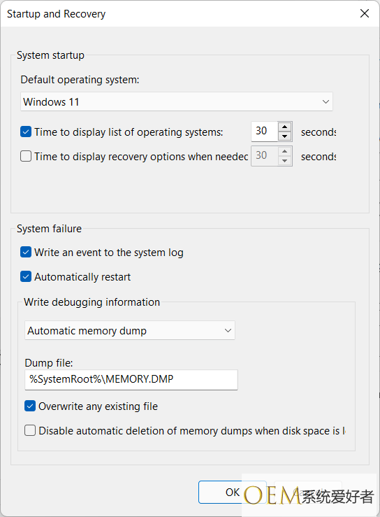 在“启动和恢复设置”部分中,您可以更改 pc 在系统故障后将执行操作,例如自动重启。