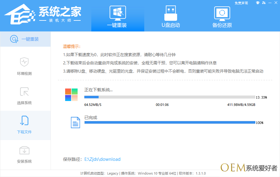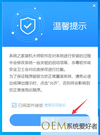 1、首先,下载系统之家装机大师;下载完毕后,关闭所有的杀毒软件,然后打开软件,软件会进行提示,仔细阅读后,点击我知道了进入工具。