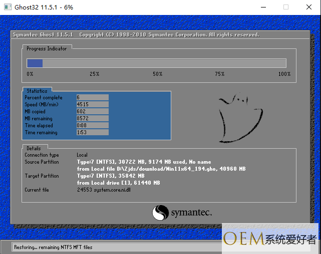 6、重启系统后,系统会默认进入PE环境,进入后,系统将会自动进行备份还原,等待完成。