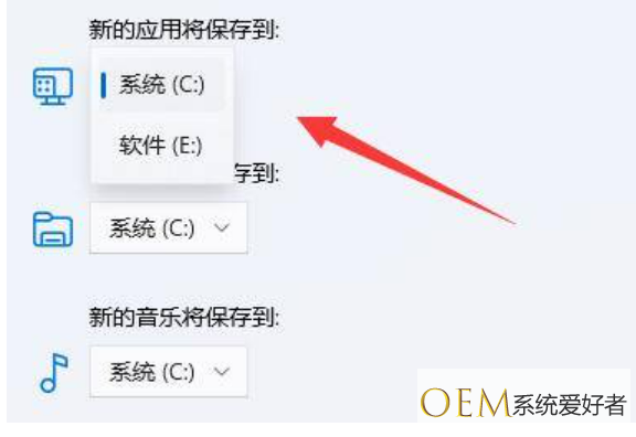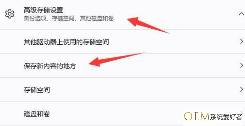 2.在高级存储设置选项中,打开保存新内容地方栏目。