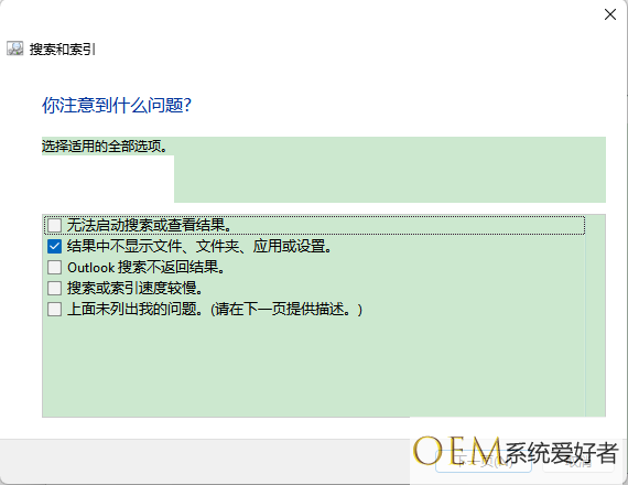 4、打开后,点击左下角“对搜素和索引进行疑难解答”。