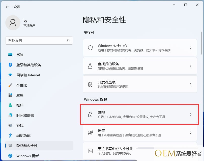 4、隐私和安全性下,找到windows 权限,再点击常规(广告 id,本地内容,应用启动,设置建议,生产力工具);