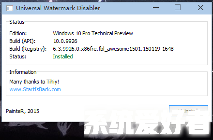下载Universal Watermark Disabler工具,运行后会显示出当前系统版本以及水印状态,「Status」中显示「Ready for installation」即已经可以去除水印了,点击「Install」按钮,稍等片刻它就会帮你去除版本号水印了。