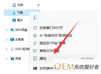 1、一般下载的文件都是保存到资源管理器中的“下载”文件夹中,因此我们先打开文件资源管理器,右键下载文件夹选择“属性”打开。