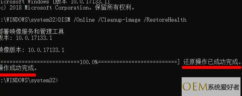 4.命令复制成功后,按下回车,在连接网络状态下,将系统映像文件中将不相同的文件还原成官方系统原文件,最后等待全部完成即可。