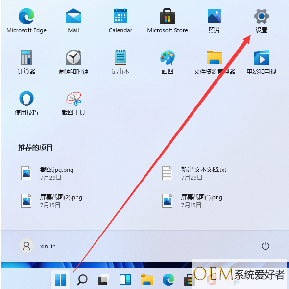 1、首先在win11桌面上打开菜单栏,点击设置。