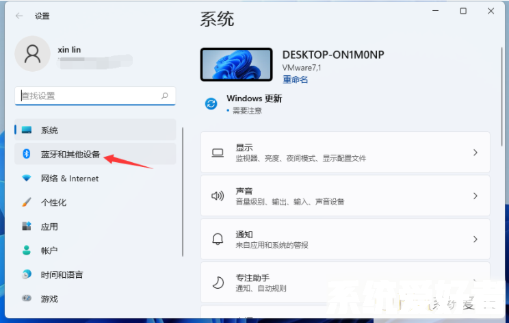 2、在弹出菜单栏界面里,点击蓝牙和其它设备。