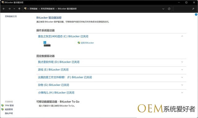 如果你的页面和我的有区别,比如显示的是Bitlocker已开启,那么上图“启用Bitlocker”按钮就将会同步变更为“关闭bitlocker”的按钮,点击他等待解密完成即可。