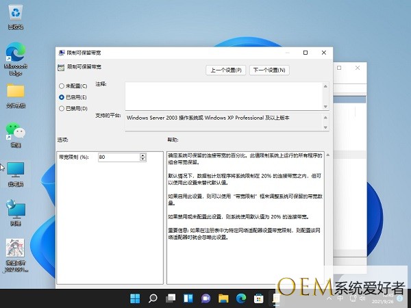 5、最后选择界面中“已启用”并设置带宽限制为“0”,点击确定即可。