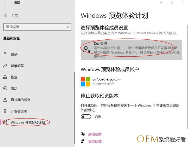 2、登录你microsoft账户,渠道选择DEV计划(必须选择DEV,其他渠道无法升级win11)