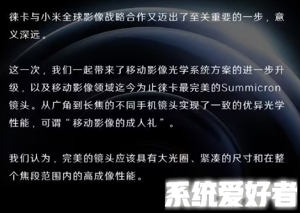 这次莱卡和Xiaomi合作的移动影像光学系统计划的进一步版本升级,以及最好的Summicron镜头,可以说是移动影像的一个里程碑。在这个移动设备日益普及的时代,人们越来越依赖手机拍照,照片质量已经成为手机的重要指标之一。而此次合作也将为用户带来更优质的摄影体验,为整个移动摄影领域的发展注入新的活力。