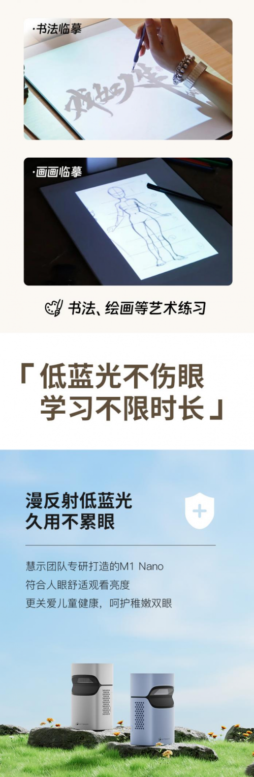 慧示M1 Nano投影仪采用的是漫反射成像原理,不像手机电视等电子屏幕,是光线直接进入眼睛,漫反射的光线更柔和。同时搭配低蓝光,能够很好地呵护儿童稚嫩的双眼,网课学习等长时间使用也不累眼。