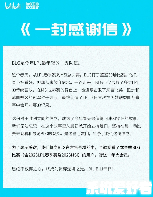 为了感谢支持BLG战队的粉丝,B站决定向全勤观看本赛季BLG比赛的用户赠送一年大会员。只要在5月21日关注了BLG战队并全程观看了他们的比赛(每场比赛观看时间不少于1分钟),就能免费获得一年大会员,这一福利相比前一天的买一送一活动更加慷慨。