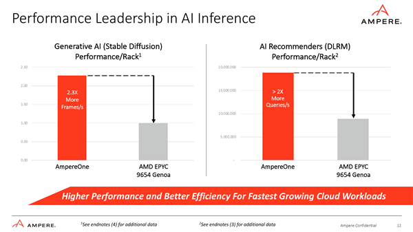 其次,在AI性能方面,Ampere宣称在Stable Diffusion和DLRM两个项目中,与AMD霄龙9654相比,其性能分别领先2.3倍和2倍。然而,需要注意的是,AmpereOne采用的是FP16精度,而AMD使用的是FP32精度,因此这样的对比并不公平。此外,大部分负载需要使用GPU来执行FP16精度计算任务。
