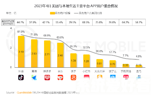 【最新资讯】5月23日消息,根据最新的QuestMobile报告显示,2023年4月,本地生活综合服务的月活用户接近5亿,全网渗透率达到了38.4%。同时,外卖服务的月活用户也接近2亿,全网渗透率为15.6%。有关机构表示,本地生活领域的竞争正处于白热化阶段。在用户规模方面,美团与抖音的重合用户超过3亿,占美团用户的比例达到了81%。抖音进军本地生活领域,成为了美团的新对手。而作为美团外卖业务的老对手,饿了么与美团的重合用户不到两成,相比之下,饿了么的用户重合率超过了七成。可以看出,美团凭借其庞大的用户基数具备明显的优势。