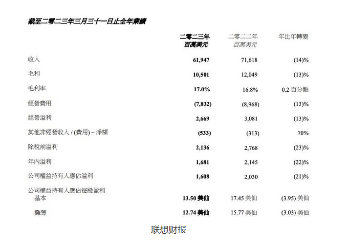 据最新资讯了解,财报还指出,非个人电脑业务增长了7%,占据了联想集团三个业务集团合并收入的近40%,同比增长了7个百分点。然而,个人电脑业务受到持续的宏观不利因素的拖累,导致联想集团的总收入下降了14%,达到619亿美元,其中汇率波动对收入产生了5%的负面影响。权益持有人应占溢利下降了21%,至16亿美元。不过,在排除一次性重组及其他费用后,该溢利下降了10%。按照非香港财务报告准则计算的净溢利下降了13%。