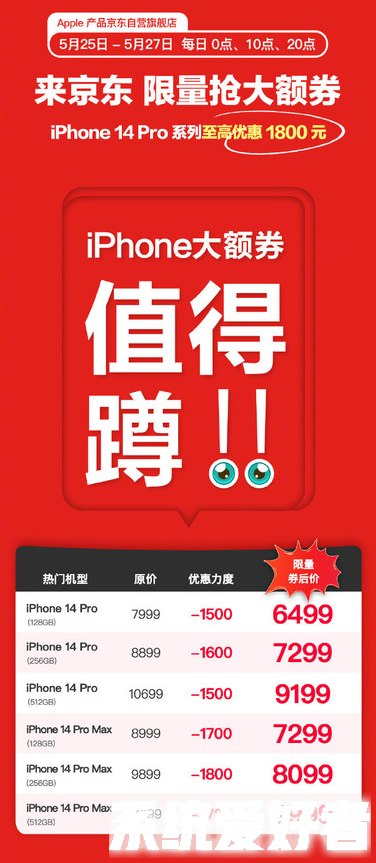 据最新消息,京东宣布推出“618提前打折”第二弹,即iPhone大券活动。活动将于5月25日至5月27日每天0点、10点和20点举行,仅限于iPhone 14 Pro系列大券,最高可享1800元折扣。