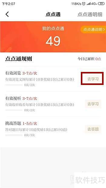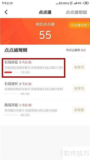 在点点通页面可以了解获取方式,只需阅读图文、观看视频和做题来积累积分。例如,点击图片或视频即可开始领取分数。